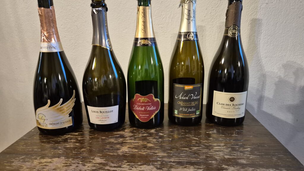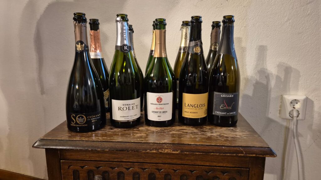 Crémant finns i 8 regioner i Frankrike och namnet får även användas för det mousserande vinet som tillverkas i Luxemburg. Vi började halvblind vinerna från alla regioner samt en ”äkta” champagne för att jämföra.